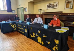 On 9th October beekeepers gathered at Great Salkeld Village Hall for the first meeting of the Winter Programme. The panel of experts, which included Fred Ayres (Chair Lune Valley Beekeepers), Stephen Barnes, (Chair of British Beekeepers Association Trustees), and Dominic Rhodes (Vice- Chair PBKA) responded to the questions posed to them by members. The session was expertly chaired by Mike Innerdale (PBKA member). The panel advised on issues such as whether treatments to destroy varroa should still be applied; how to deal with lots of bees remaining on the crown board/ bearding on the outside of the hive in early autumn by removing the queen excluder and how to recognise the on set of Chronic Bee Paralysis Virus which is becoming increasingly common. During the refreshment break members chatted to each other, swopping the ‘tricks and tips’ they had used to meet the challenges that the summer season had presented.